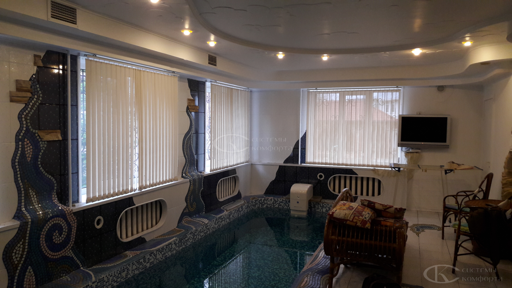 - Пластиковые и алюминиевые ламели. Более строгий и современный вариант. Легко чистятся, абсолютно влагостойки, подходят для зимних садов или окон в бассейне.