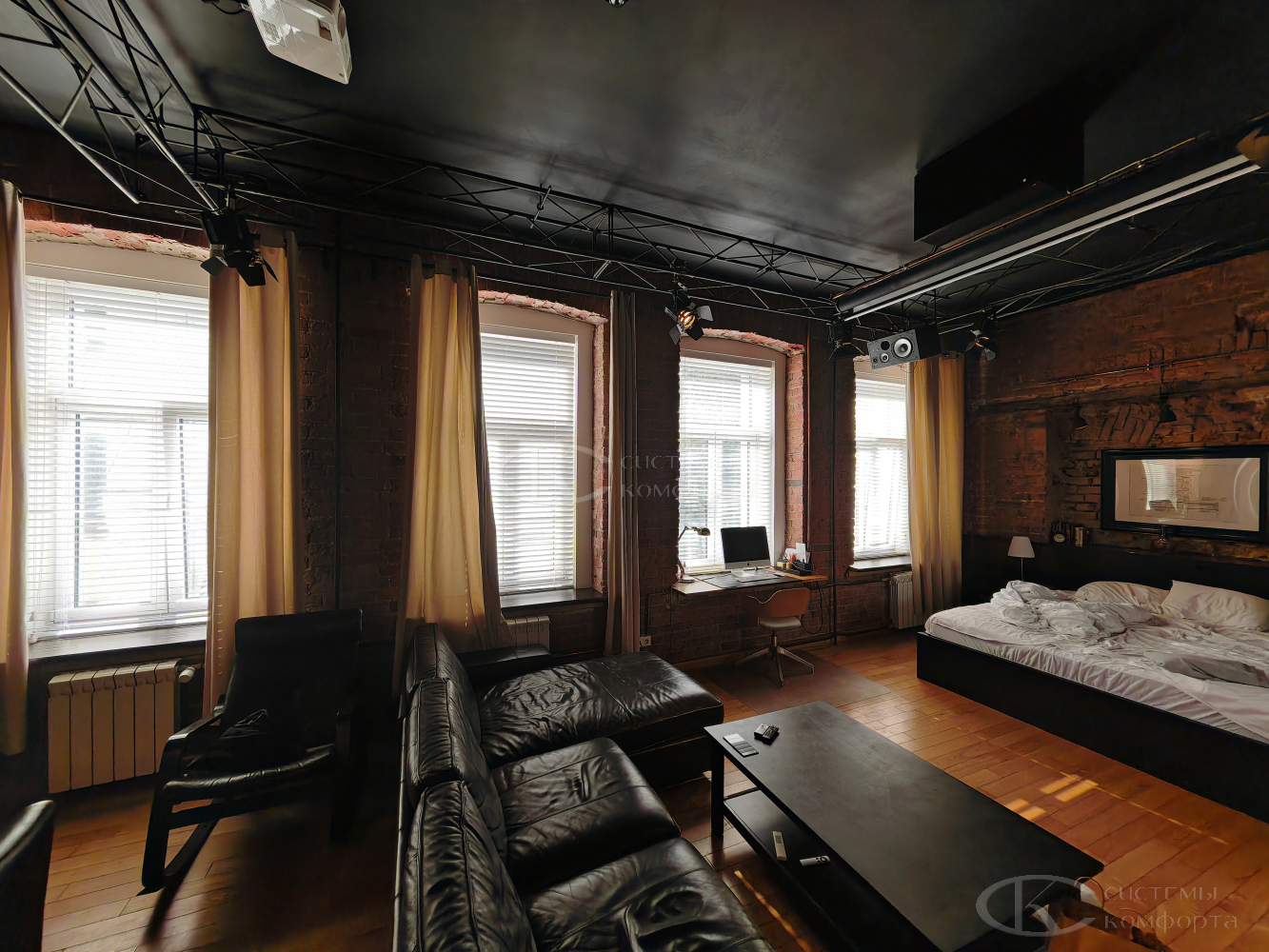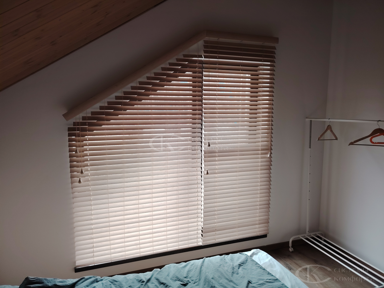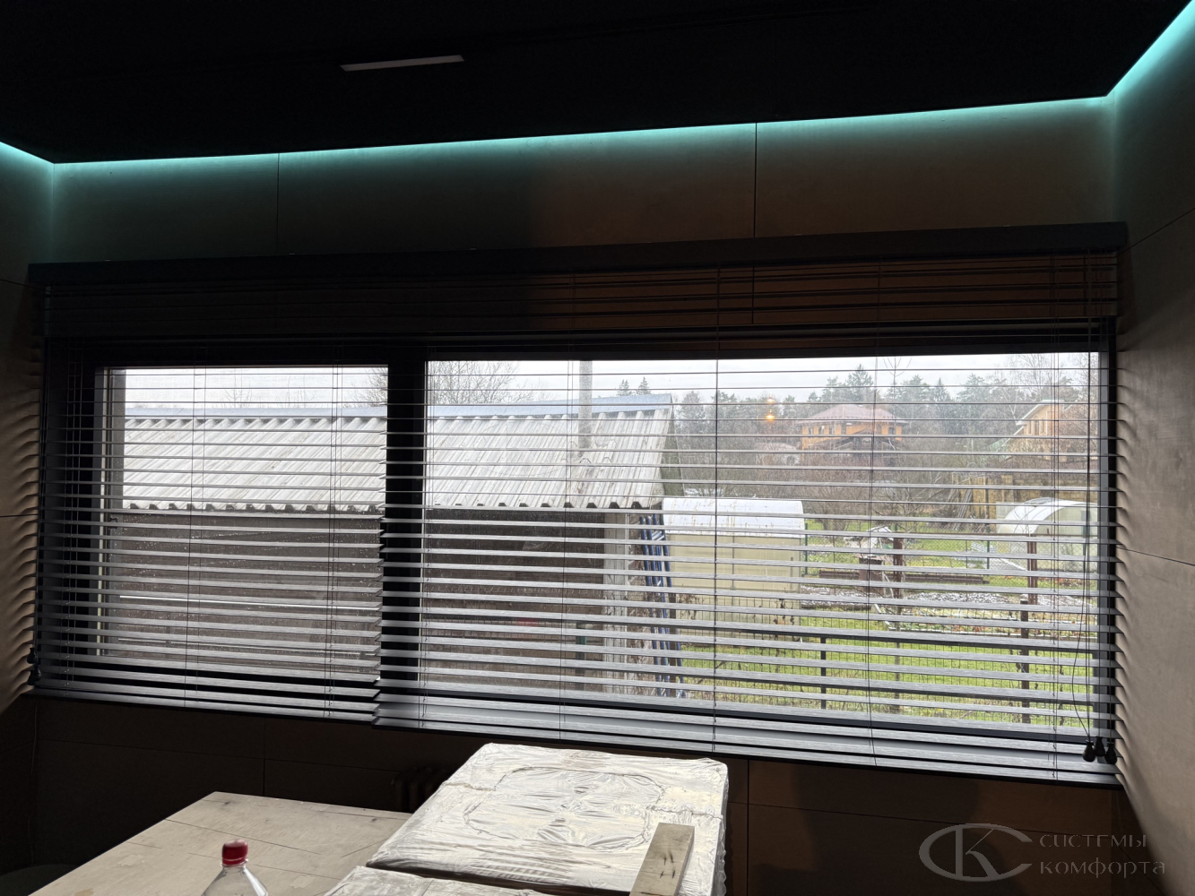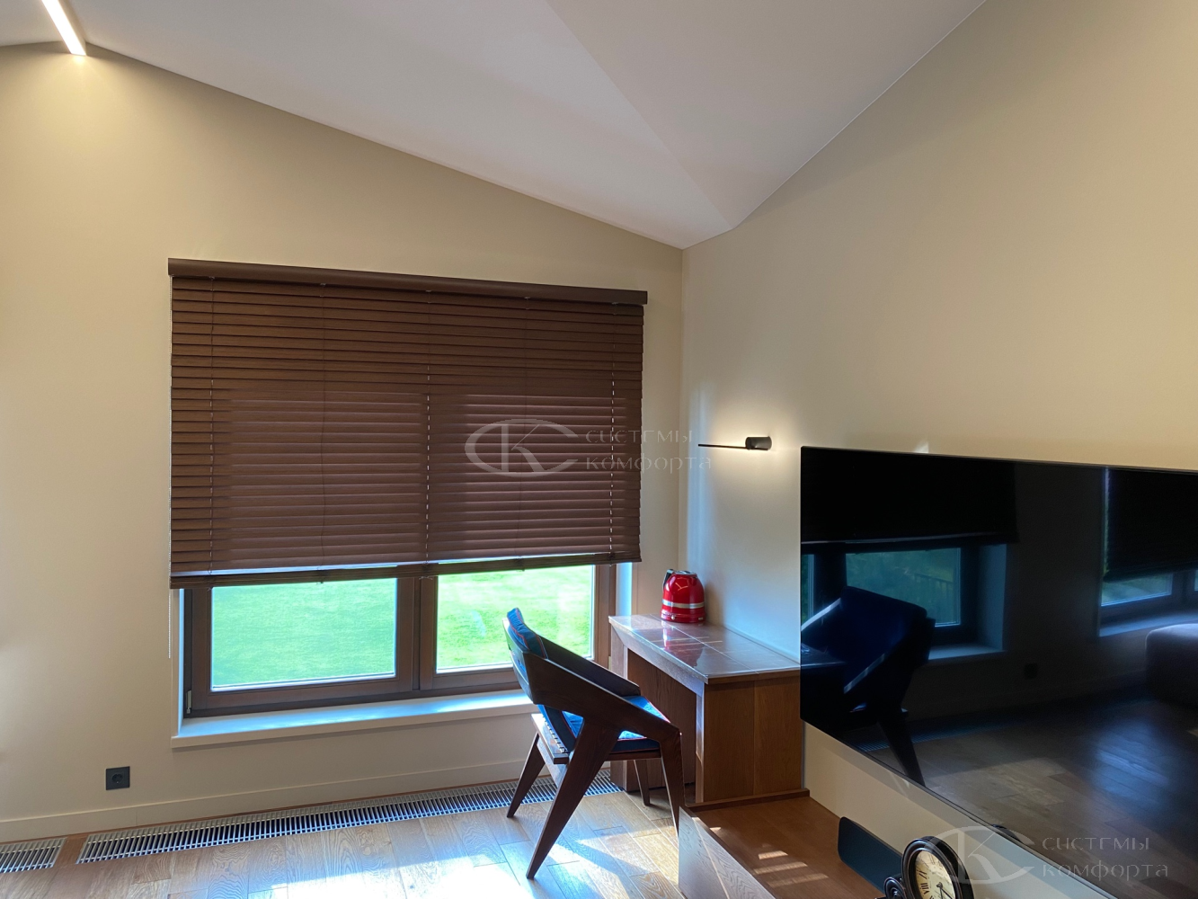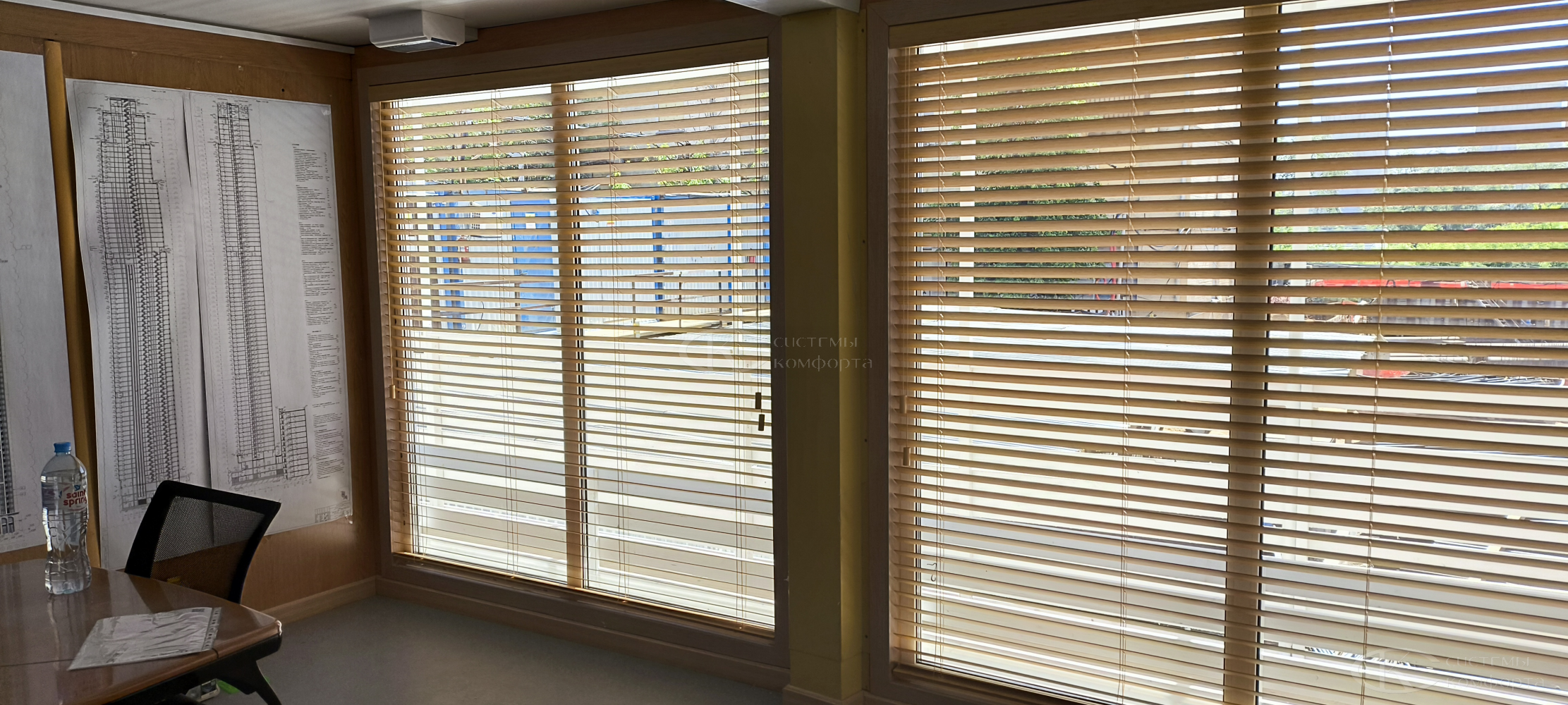 - Тип системы. Горизонтальные алюминиевые – наиболее бюджетный вариант, деревянные, римские шторы или системы с электроприводом будут дороже.